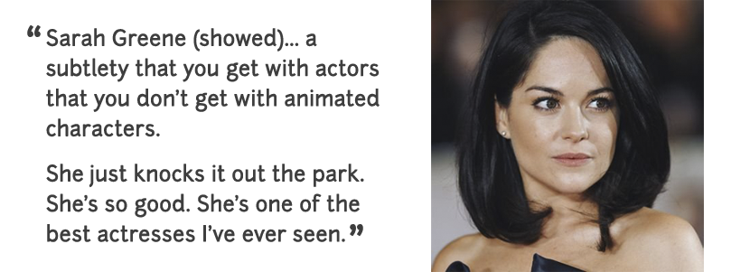 She would even try scenes in so many different ways, which is just a subtlety that you get with actors that you don't get with animated characters. This is the whole thing. When I was working with Sarah, I would say to her, "You're at an 8 out of 10 there on evil and we want you to dial it back to a 2." And her whole face would change to a 2. And you're like, "That's it. That's the one." She would have that sadness in her eyes. She was just telling John all the things she had to do and there was this inevitable sadness in her eyes as she knows what she's doing. She knows it's wrong but she has to do it for her son. And that's quite a complex emotion to convey. There are mixed emotions there. To try and convey that with an animation or motion capture or whatever is pretty tough. And like you say, if an actress is good, she'll just sell it for you.