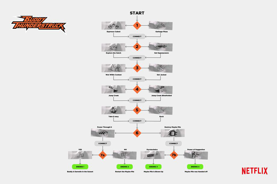 • Buddy Thunderstruck is a Netflix series that chronicles the adventures of Buddy, the fastest dog on eighteen wheels, as he navigates the speed-hungry town of Greasepit. Buddy Thunderstruck: The Maybe Pile is a special interactive episode that is available to watch on Netflix (subscription required).