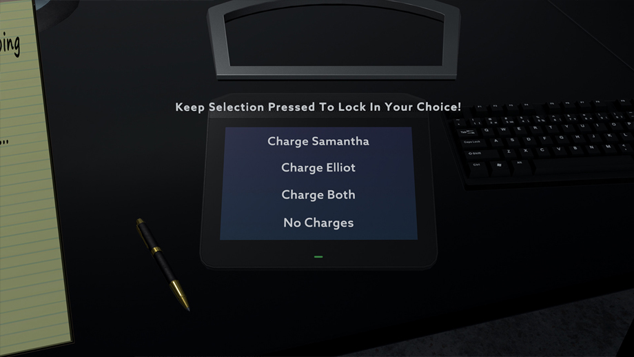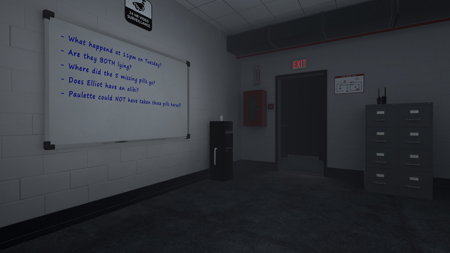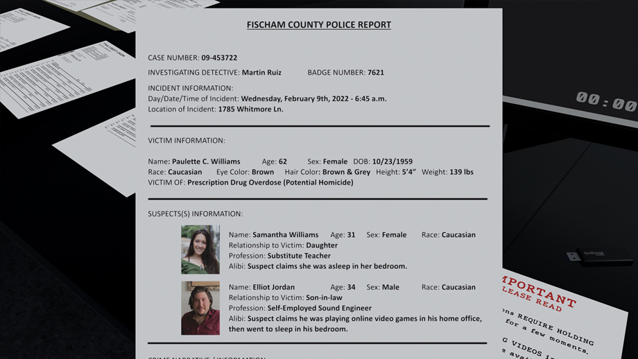 Paulette Williams, age 62, has been killed. There are only two possible suspects. In this real-time, police interrogation simulator, you take on the role of the lead detective in the observation room. You must guide your partner to uncover the truth. Put your detective skills to work, as you attempt to seek justice and bring this case to a close.