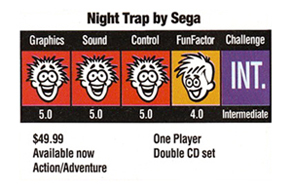 • Night Trap is infamous for its part in the 1990s Congressional hearings on video game violence. These hearings eventually led to the ESRB rating system.