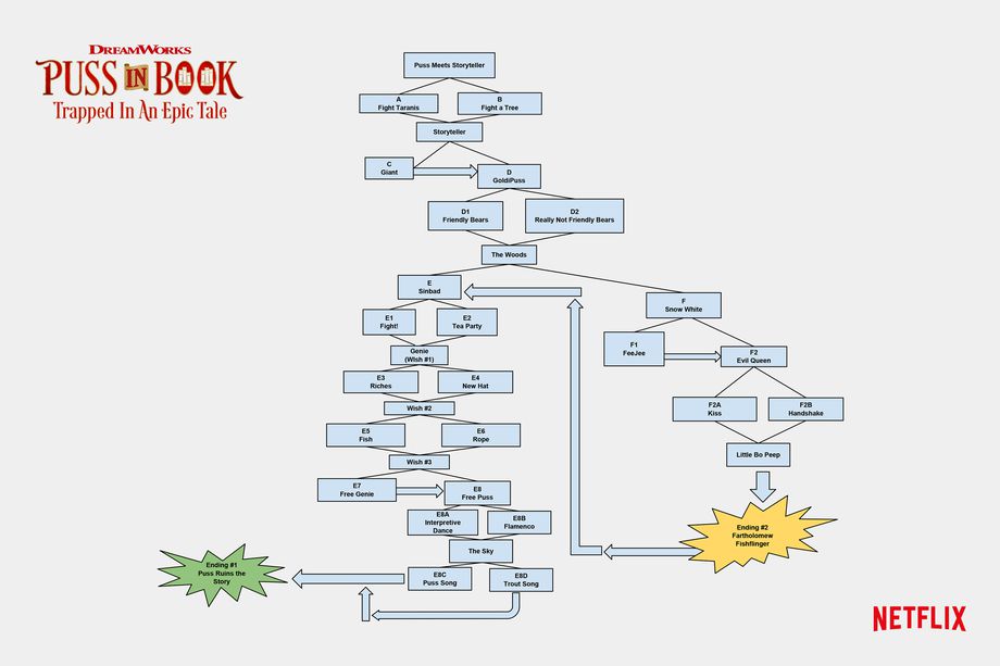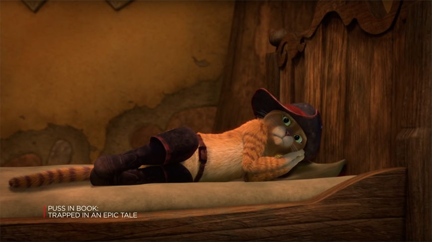 • Puss In Book: Trapped in an Epic Tale is an interactive Netflix short that chronicles the adventures of Puss in Boots, a swashbuckling talking cat, as the viewer makes decisions for him. It is available to watch on Netflix (subscription required).