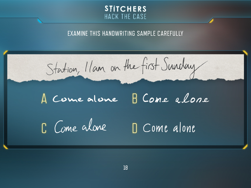 The Stitchers Program is a secret government agency that uses memories of the recently departed to solve mysteries before they go to the grave. Looking to enlist a number of new recruits, you've been chosen to step into the mind of a murder victim and see if you have what it takes to become a Stitcher. (description from the iTunes App Store Page)