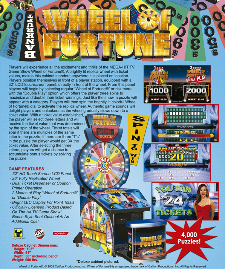 Players will experience all the excitement and thrills of the MEGA-HIT TV Game Show Wheel of Fortune. A brightly lit replica wheel with ticket values, makes this cabinet standout anywhere it is placed on location.